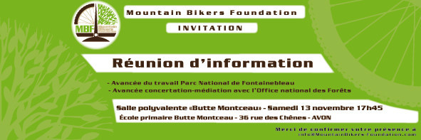 A la fin de la réunion, MBF a rappelé sa volonté d'être représentée au sein du Conseil d'Administration du futur GIP, en tant qu'interlocuteur d'une activité majeure sur le massif de Fontainebleau. Il est en effet indispensable pour MBF que le VTT soit recconue comme une activité majeure sur le Massif Forestier !