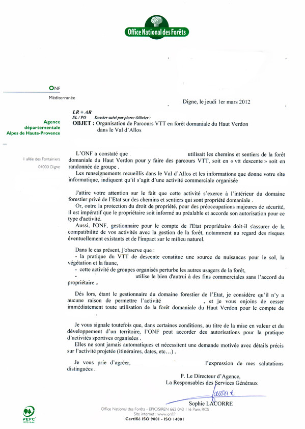L'antenne de l'ONF du Val d'Allos vient de mettre en demeure une entreprise de guides VTT de cesser toute activité sur la forêt domaniale du Haut Verdon.